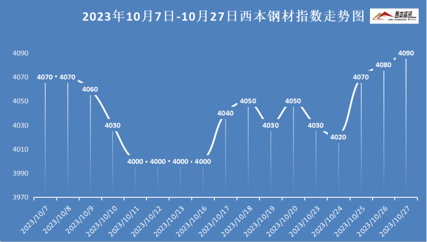 截止10月27日,西本钢材指数收在4090,较上月末持平,较去年同期价格下跌40,同比下跌0.96%。