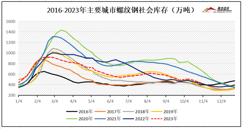 从钢厂库存来看,据中钢协数据显示,2023年10月中旬,重点统计钢铁企业钢材库存量 1651.32万吨,比上一旬增加15.21万吨,增长0.93%:比上月同旬增加 75.64万吨,增长 4.80%;比去年底增加 343.88 万吨,增长26.30%;比去年同旬减少120.52 万吨,下降 6.80%,比前年同旬增加 366.67万吨,增长28.54%。