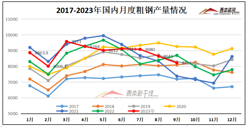 2023年1-9月,中国粗钢产量79507万吨,同比增长1.7%;1-9月生铁产量67516万吨,同比增长2.8%;1-9月钢材产量102887万吨,同比增长6.1%。