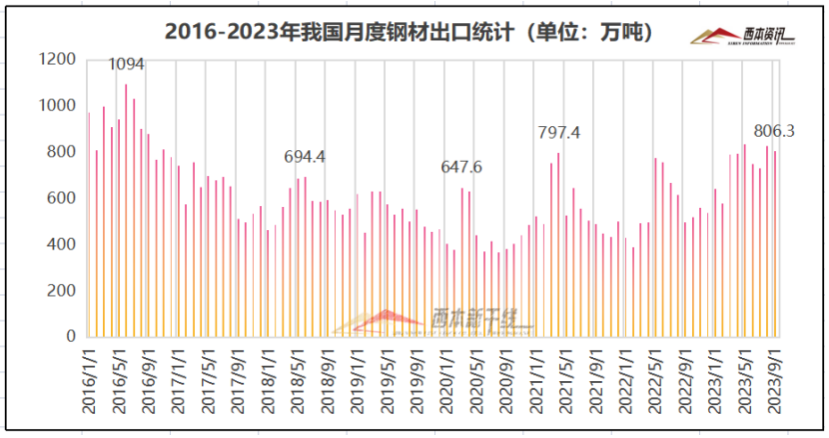 从钢材进出口数据来看,海关总署数据显示,2023年9月,我国出口钢材806.3万吨,环比减少21.9万吨,降幅 2.6%;均价 814.2 美元/吨,环比上涨 3.5美元/吨涨幅0.4%。1-9月累计出口钢材 6681.8万吨,同比增长1611.2万吨,增幅 31.8%。