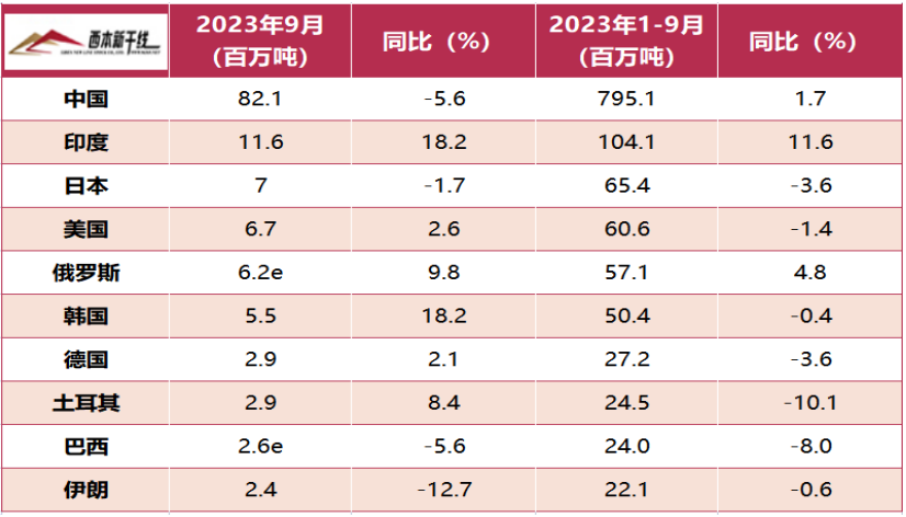 中国9月粗钢产量为8210万吨,同比下降5.6%;印度9月粗钢产量为1160万吨,同比增加18.2%;日本9月粗钢产量为700万吨,同比下降1.7%;美国9月粗钢产量为670万吨,同比增加2.6%;俄罗斯9月粗钢产量为620万吨,同比增加9.8%;韩国9月粗钢产量为550万吨,同比增加18.2%;德国9月粗钢产量为290万吨,同比增加2.1%。