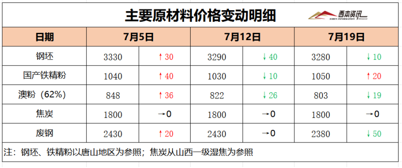 本周国内主要原料多数见跌,其中,进口矿价震荡下跌,钢坯行情先扬后抑,国产矿稳中略涨,焦炭行情延续平稳,废钢行情先强后弱,分品种来看: