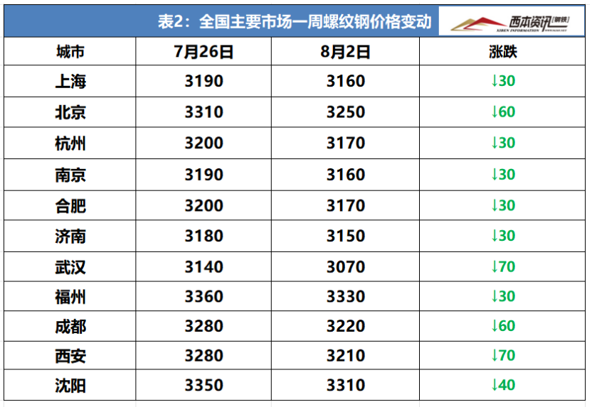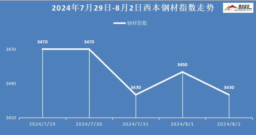 本周国内建筑钢材震荡下跌,截至8月2日,西本指数报在3430,较上周五下跌40。