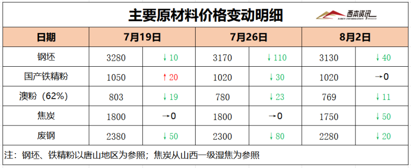 本周国内主要原料多数下跌,其中,进口矿价偏弱震荡,钢坯行情震荡走低,国产矿弱势盘整,焦炭行情整体见跌,废钢行情小幅下跌,分品种来看: