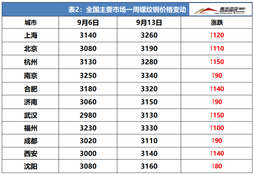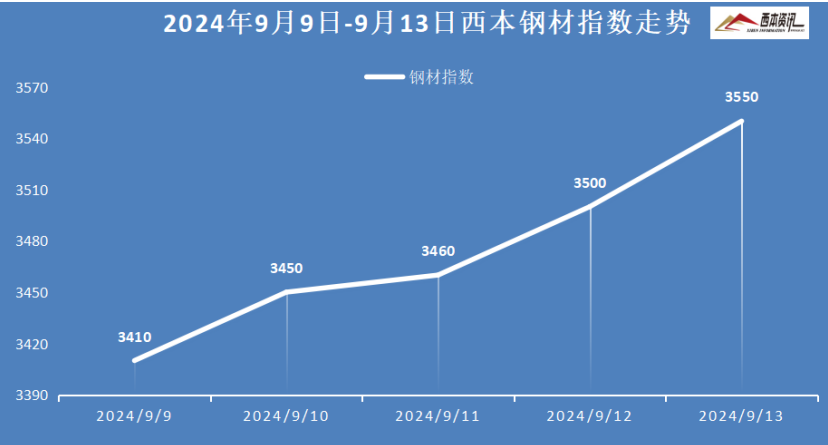 本周国内建筑钢材大幅反弹,截至9月13日,西本指数报在3550,较上周五上周100。