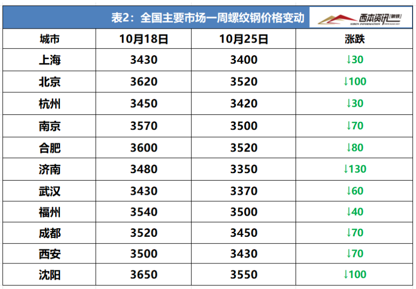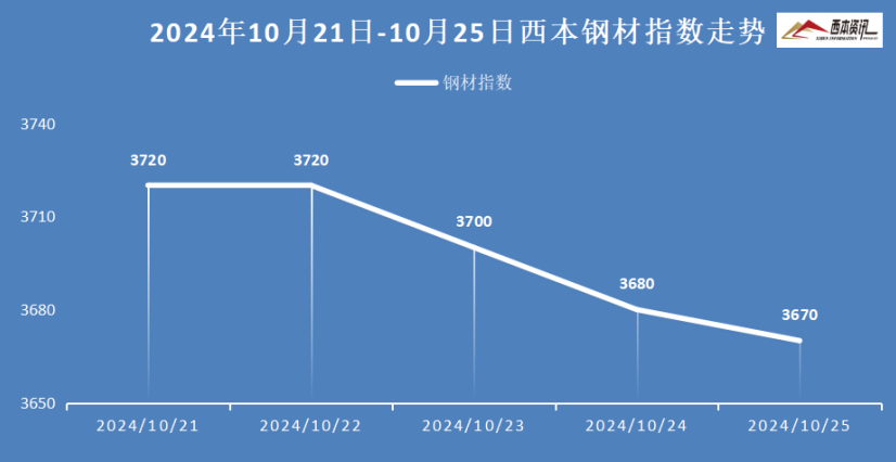 本周国内建筑钢材弱势下跌,截至10月25日,西本指数报在3670,周环比下跌50。