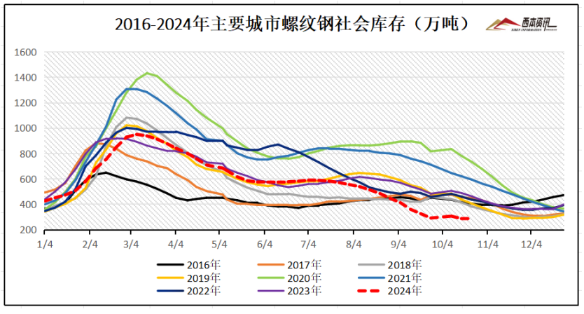 从中钢协数据显示,2024年10月中旬,重点统计钢铁企业粗钢平均日产207.2 万吨,日产环比增长1.1%;钢材平均日产200.7万吨,日产环比增长3.8%。10月中旬,重点统计钢铁企业钢材库存量1546万吨,环比上一旬增加73万吨,上升5%;比上月同旬减少19万吨,下降1.2%。