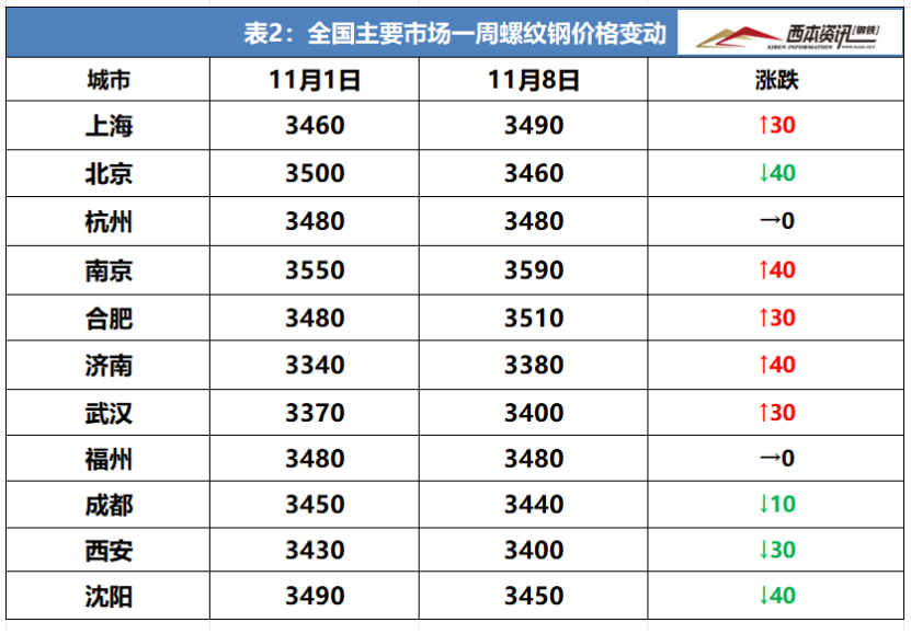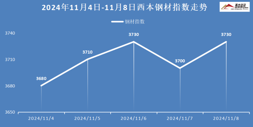 本周国内建筑钢材震荡调整,截至11月8日,西本指数报在3730,周环比上涨20。