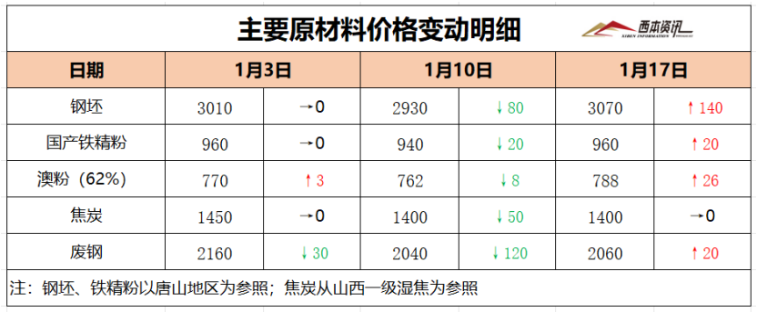 本周国内主要原料多数上涨,其中,进口矿价小幅探涨,钢坯行情大幅冲高,国产矿小幅见涨,焦炭价格跌后暂稳,废钢价格小幅抬升,分品种来看: