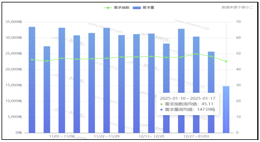 从终端需求来看,据钢小二平台周均值数据显示,1月17日全国工程需求量周均值为14739吨,环比周均值下降38%。其中,上海周均值5577吨,环比周均值下降;广州2875吨,环比周均值下降;杭州2657吨,环比周均值下降。工程需求pmi为45,需求较差。