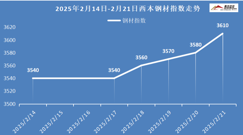 本周国内建筑钢材行情接连推高,截至2月21日,西本指数报在3610,周环比上涨70。
