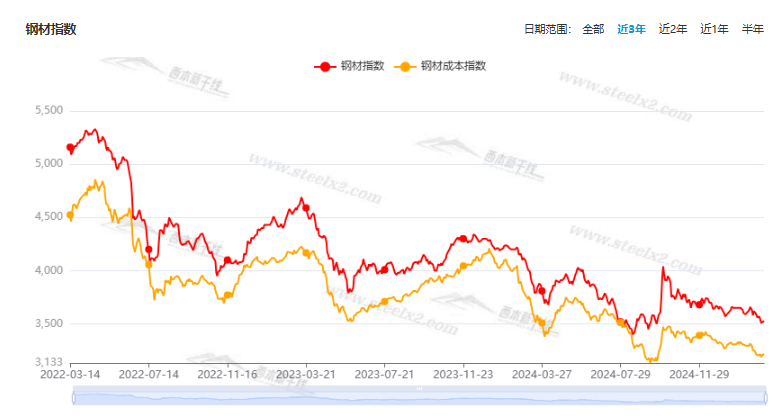 本期,全国各地市场建筑钢材价格先抑后扬:其中,北方需求偏弱,区间起伏;南方期货引导,跌后回升。本周西本钢材指数下移,成本指数徘徊,显示长流程钢厂利润空间收缩;本周螺纹钢期货主力合约低位反复,对现货市场有示范效应。(下图为红色线条为钢材指数,黄色线条为成本指数)