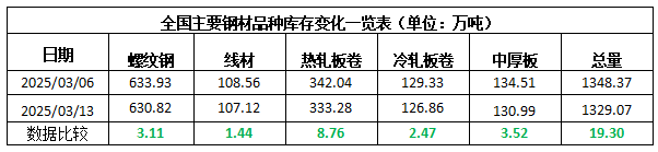 据中国钢铁工业协会统计数据显示,2025年3月上旬重点钢企生铁日均产量188.8万吨,旬环比下降5.0%,同比上升3.6%;粗钢日均产量213.2万吨,旬环比下降5.6%,同比上升2.4%;钢材日均产量200.7万吨,旬环比下降12.8%,同比上升4.1%。3月上旬重点钢铁企业钢材库存量为1624万吨,旬环比减少7万吨,下降0.4%;比上月同旬增加3万吨,上升0.2%;比去年同旬减少328万吨,下降16.8%。