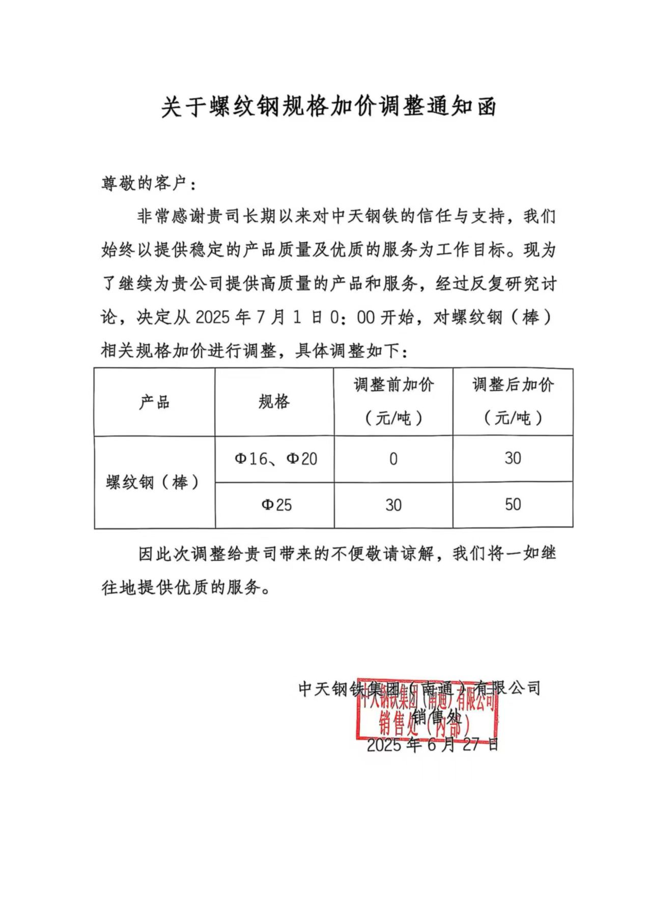 6月27日中天钢铁对螺纹个别规格极差调整信息