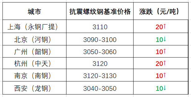 截至午间,国内部分市场螺纹钢(抗震)基价如下:上海市场3110元/吨;北京市场3090-3100元/吨;广州市场3050-3060元/吨;杭州市场3120元/吨;南京市场3120-3130元/吨;西安市场3040-3050元/吨。环比来看,截至上午收盘,全国主要市场一线品牌价格多数调高,少数趋弱。