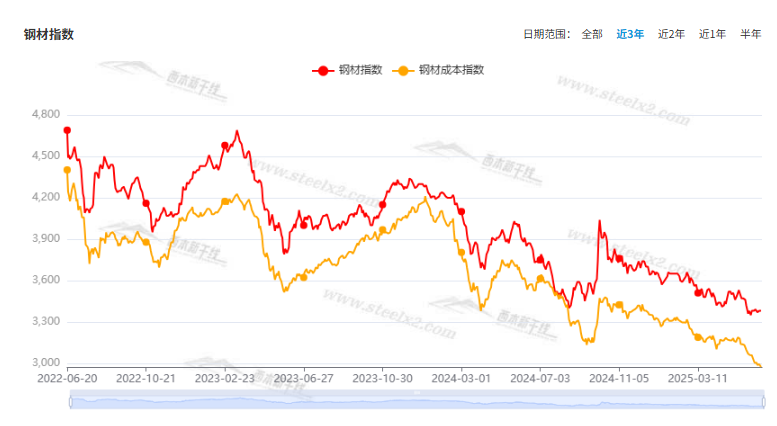 本期,全国各地市场建筑钢材价格震荡收跌:其中,北方需钢厂托举,稳中小跌;南方期现同步,上下摇摆。本周西本钢材指数盘整,成本指数下移,显示长流程钢厂利润空间略有回升;本周螺纹钢期货主力合约窄幅波动,与现货基本同频。(下图为红色线条为钢材指数,黄色线条为成本指数)