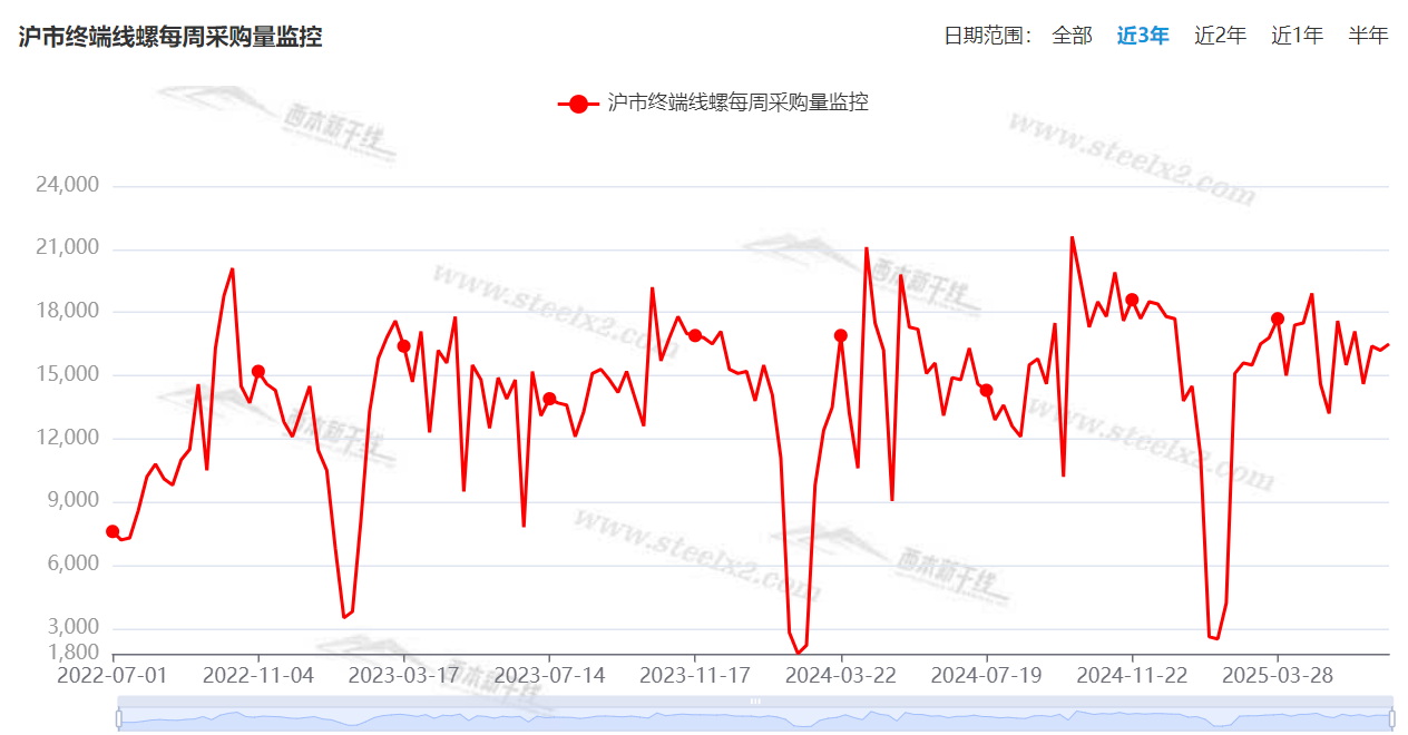 本期,西本资讯监测的沪市线螺周终端采购量为1.65万吨,周环比增加1.85%(见下图)。本周终端需求环比略有回升,但增幅有限。