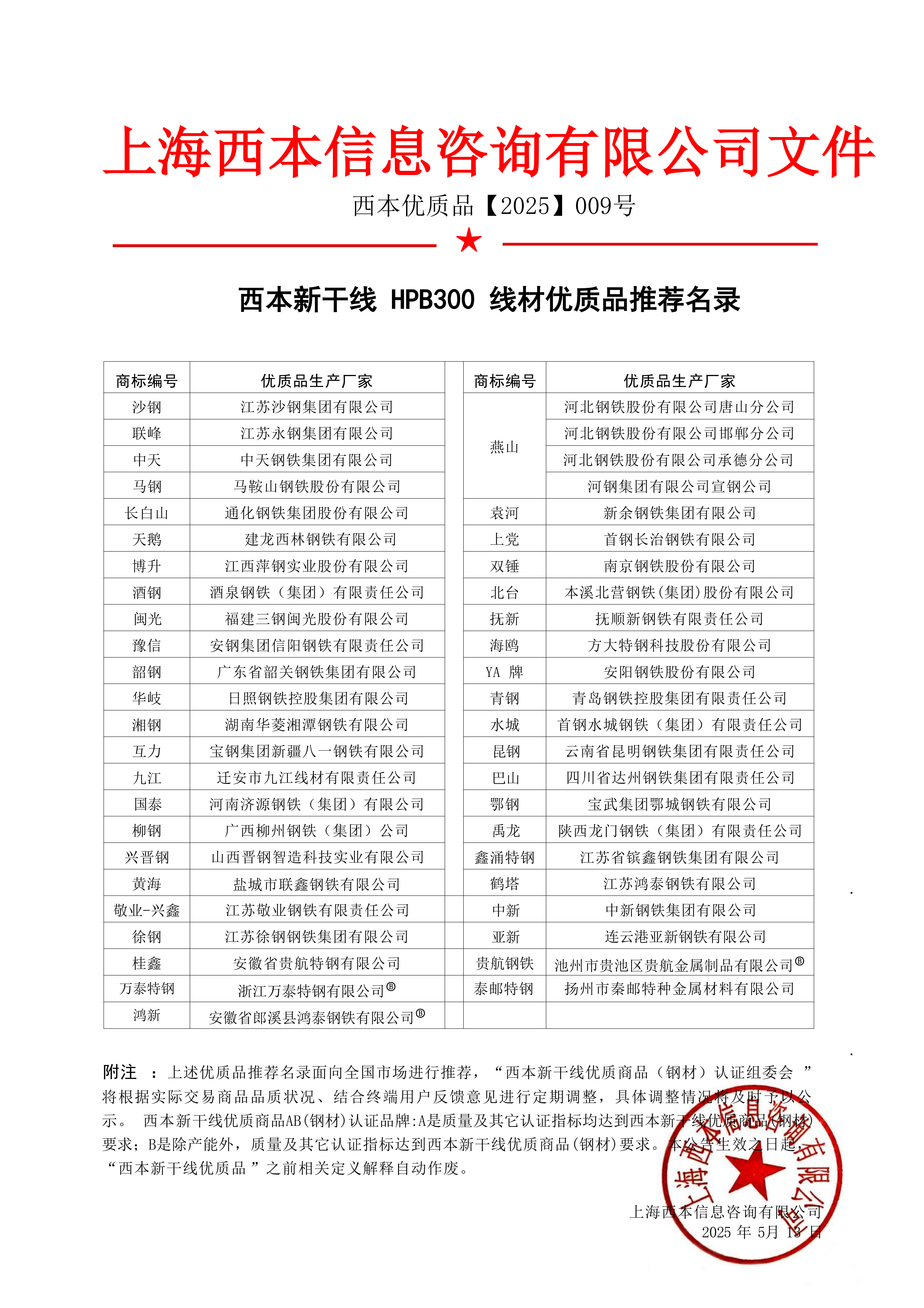 西本新干线优质品是由西本新干线委托西本新干线优质商品(钢材)认证组委会联合国内多家钢材产品质量检测机构,严格按照评审管理办法,对企业产品质量管理体系及其市场信誉等进行综合评估合格后而注册的优质钢材品牌。西本新干线优质品认证真正开创了行业第三方独立监控的先河,为钢铁产品流向监控和逆向品质追溯创造有利条件;对确保市场流通钢材质量,对多渠道监控钢材质量安全,维护整个行业的健康、有序、长远发展产生着积极影响。